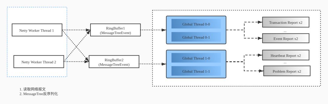 我们挑选了大概 10 个 Analyzer 加入这个大的 RingBuffer 来处理,但无论如何如何增大 buffer 消息丢弃情况还是有点多,特别是较为重要的 Transaction/Problem 等 Analyzer 的消息。