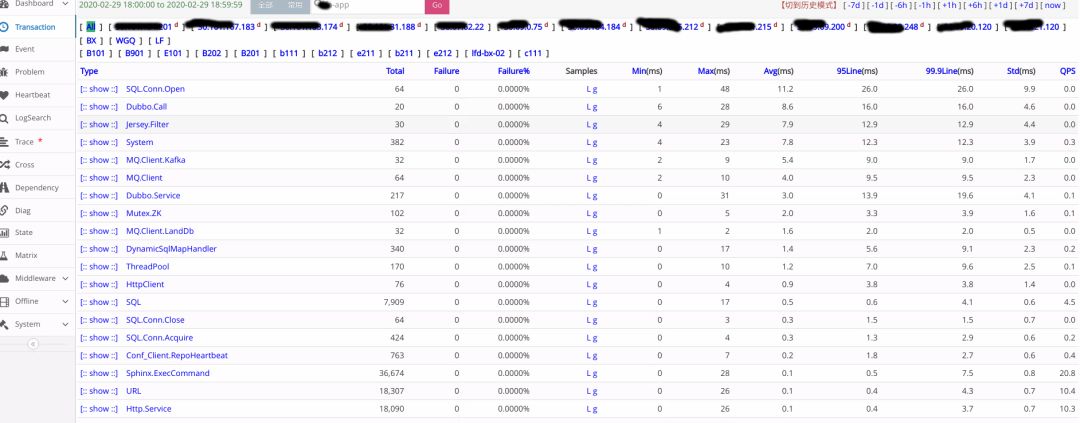 下图是应用的 Transaction 报表,集成了多个中间件打点: