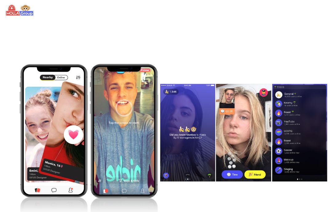 HOLLA Group 的两个 App,HOLLA 和 Monkey 的主要市场都在北美,面向年轻一代的用户俗称 Z 世代(注:美国及欧洲的流行用语,意指在 1990 年代中叶至 2010 年前出生的人)。HOLLA 的产品使命是为用户创造佳缘,找到 date,而 Monkey 定位为全球 Z 世代的社交探索平台,在 Monkey 上用户可以快速的、一对一的找到趣味相投的朋友进行视讯聊天,Monkey 还拥有自己的潮牌。