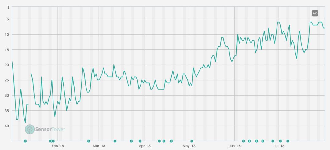 △ Monkey App 在 2018 年美国 iOS 榜单的排名上升趋势