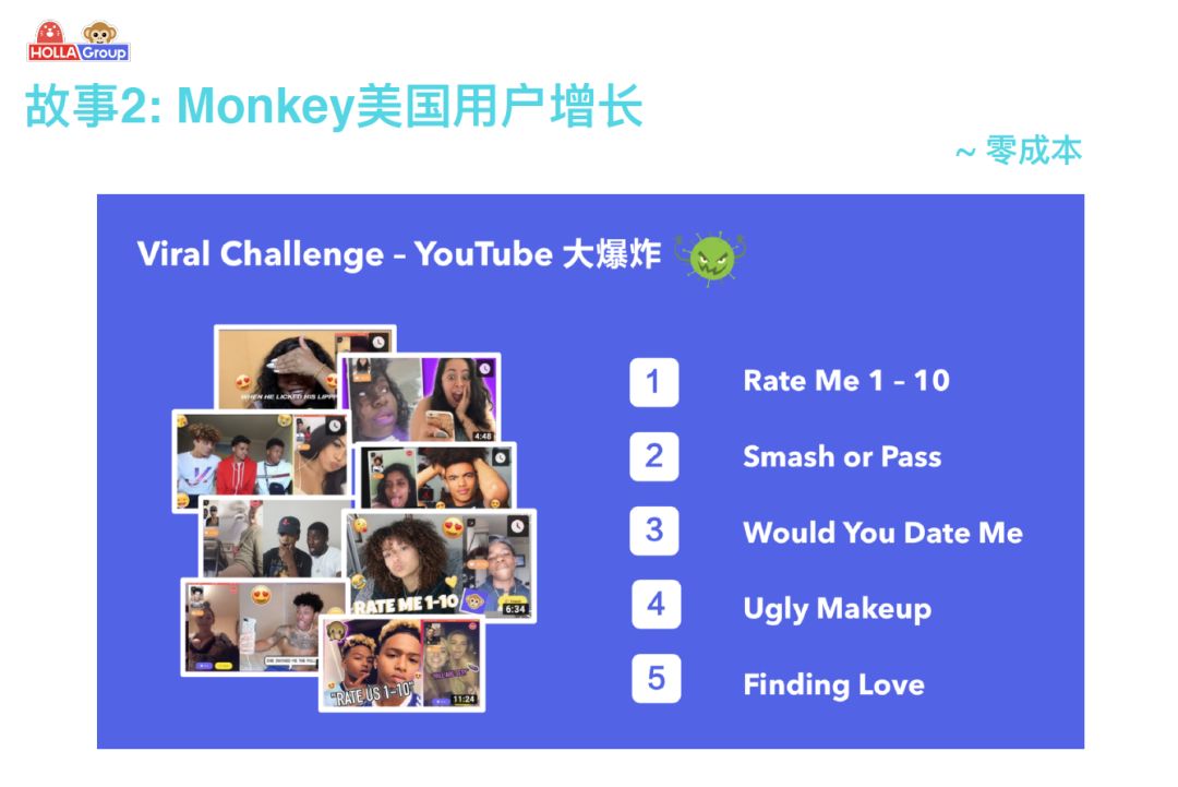 今天分享的是 Monkey 在 Youtube 视频平台上做的一系列 KOL 病毒营销,让我们通过几乎零成本的方式产生了上万个视频,获取了上千万的用户。如果去 YouTube 上搜索下面的任何一个关键词,都是可以搜到连着几天都看不完的网红视频。这些视频达到的曝光量和转化不是靠广告预算砸出来的,因为社交产品砸钱烧硬广很容易获取到对产品不那么感兴趣的用户,我们希望用更加真诚,有趣的方式去吸引到对产品真正感兴趣的用户。
