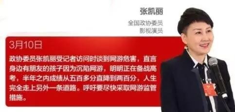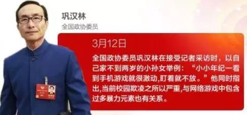 符宇航等十名代表联合建议:网游如精神鸦片极大危害青少年,需要严控。而为人熟知的政协委员巩汉林不惜“家丑外扬”,提出自己不到两岁的孙女就喜欢“盯着手机不放”。