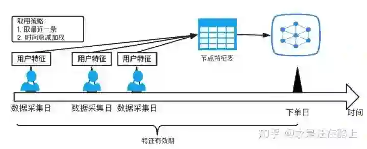 接下来,我们就会考虑如何去扩充节点特征表中的用户量?最直接的做法——我们把历史全量用户的特征都拿过来用不就行了?但需要注意的是,用户特征具有时效性。 所谓 时效性,是指用户特征是否能有效反映用户最近的风险。 因此,贪多反而会引起特征质量下降,两者需要做权衡。
