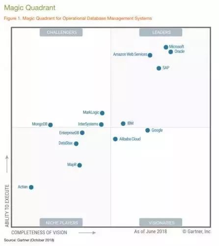 今年的数据库魔力象限领导者象限依旧为Oracle、Microsoft、IBM等传统数据库公司,与去年相比不同的是,远见者(Visionaries)象限中,仅有阿里云与谷歌。