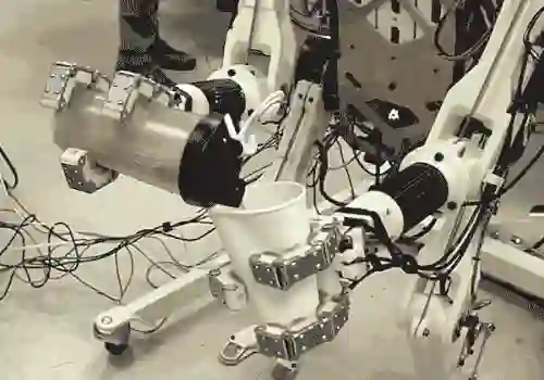 MIT 研究人员第一次给 HERMES 通电时,它还只有一双腿。那时机器人没法自己站立,他们把它悬挂在马具上。研究人员对机器人进行了简单测试:把它的左腿编程为踢腿,然后把一个塑料垃圾桶置于它面前。然后,他们看到 HERMES 把垃圾桶踢飞了……