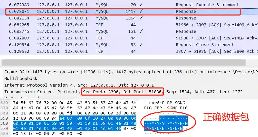 下面截图的是倒数第 2 个 Response 数据包,由 MySQL Server 返回给 Proxy 的,Payload 中能看到那条记录的数据: