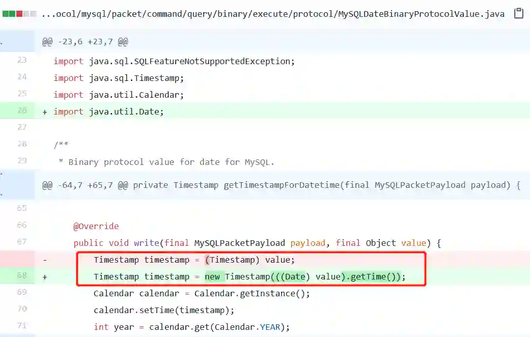 由于我们的数据表中存在一个 date 类型的字段,改动的这行代码却强制将 date 类型转换成了 Timestamp 类型,因此抛出了异常。还有几个疑点,我结合对源代码的理解逐一解答下。