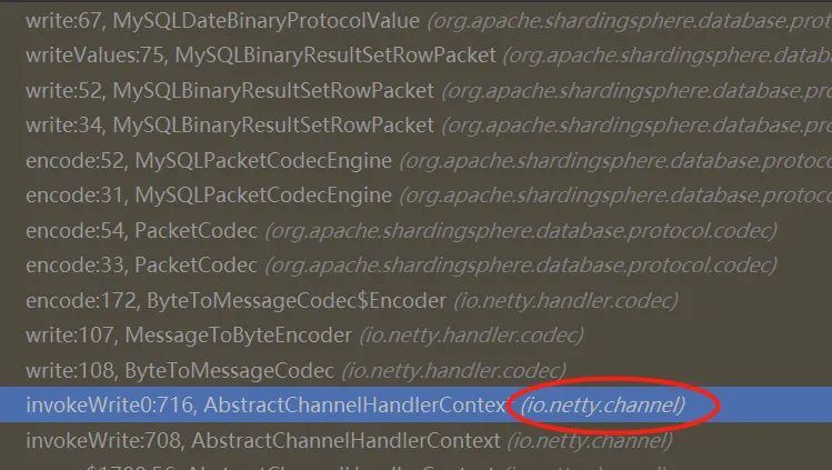 上面截图的是:抛出 ClassCastException 那个方法的整个调用链。由于 ShardingProxy 并没有捕获这个 RuntimeException 以及打印日志,最终这个异常被 netty 吞掉了。