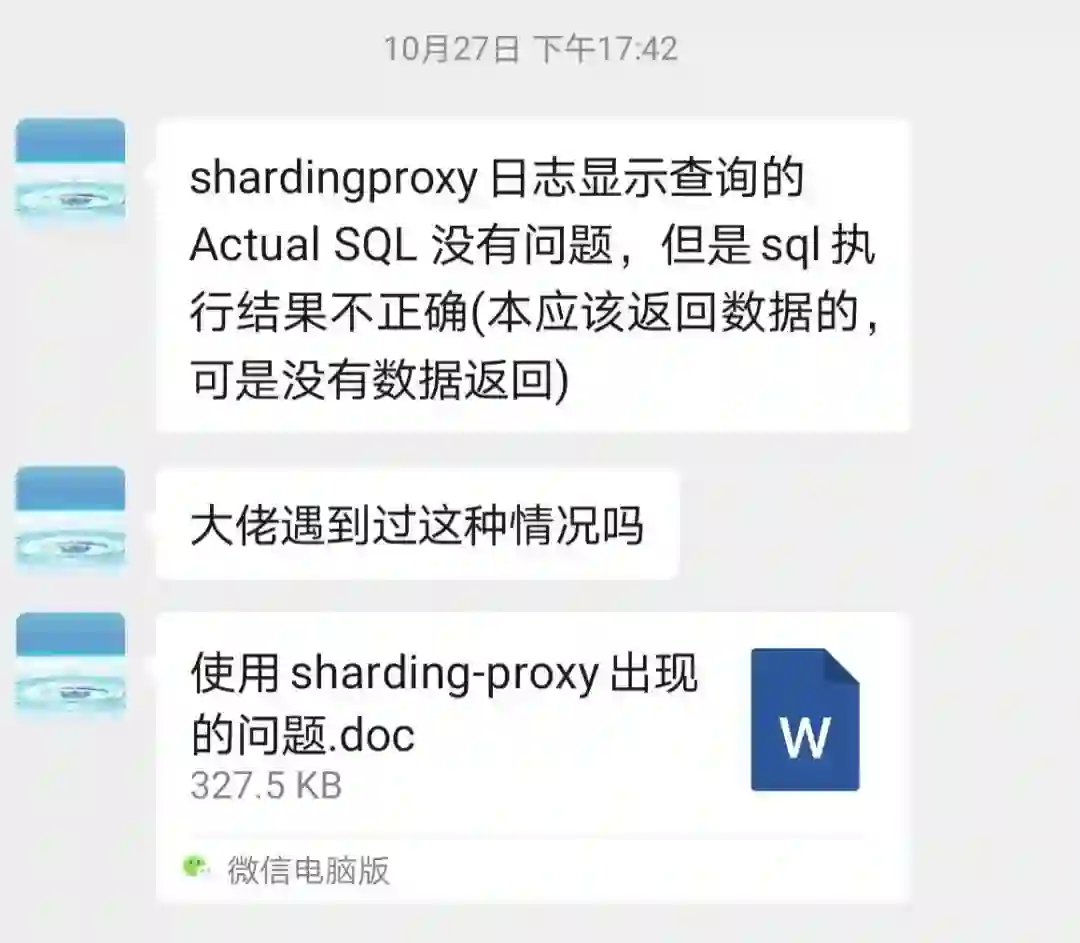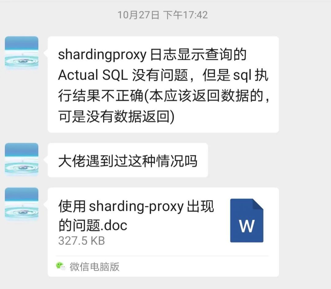 这个 Bug 来源于我的公号读者,他替公司预研 ShardingProxy(属于 ShardingSphere 的子产品,可用作分库分表,后文会详细介绍)。他按照官方文档写了一个很简单的 demo,但是运行后无法查询出数据。