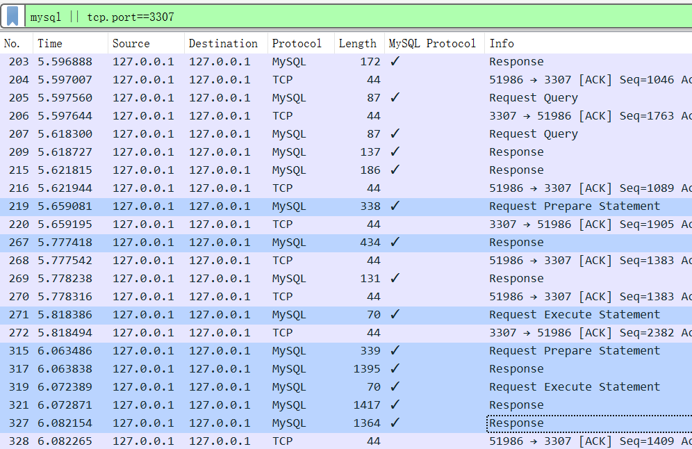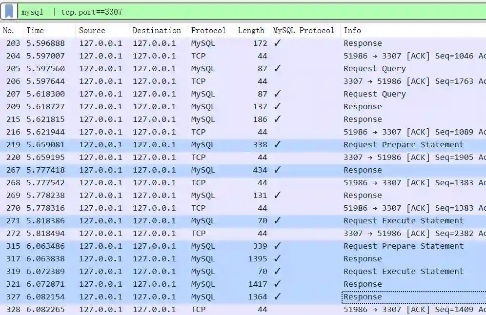 Wireshark 如何抓取 MySQL 协议的数据包,这里就不展开了,大家可以网上查下资料。注意将 Wireshark 的过滤条件设置成: