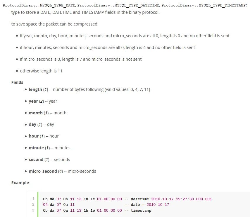 针对 date 类型的字段,ShardingProxy 通过 JDBC 的 API 从查询结果中拿到的仍然是 Date 类型,之所以要转换成 Timestamp,这个又跟 MySQL 的协议有关了,下面是 MySQL 官方文档的说明: