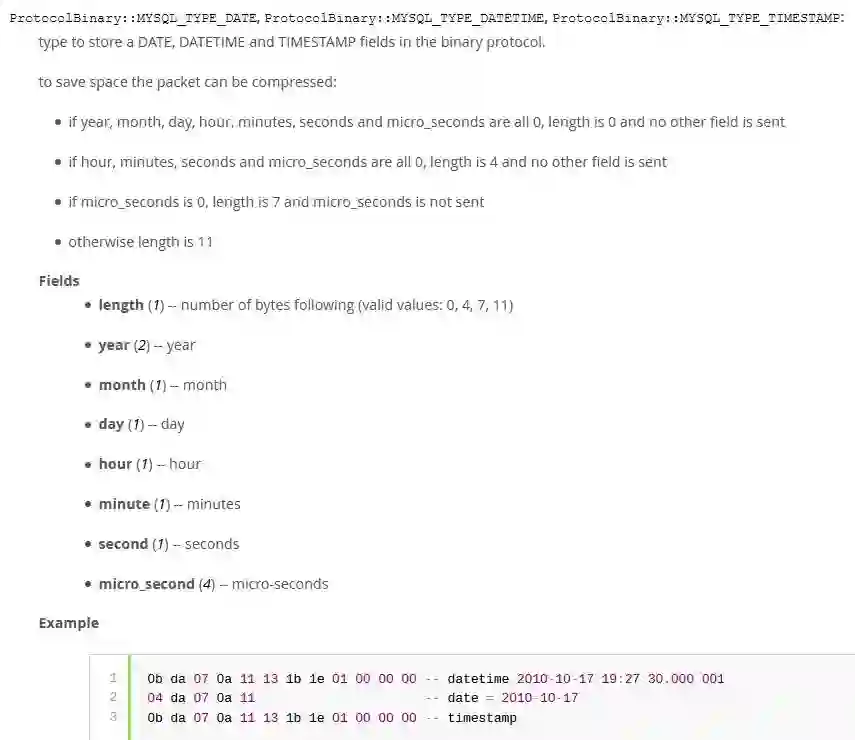 简单理解就是:ShardingProxy 在代码实现时,用了一个范围最大的 timestamp 存了三种可能的值 date, datetime 和 timestamp,然后再按照上面这个协议规范进行二进制的写入。