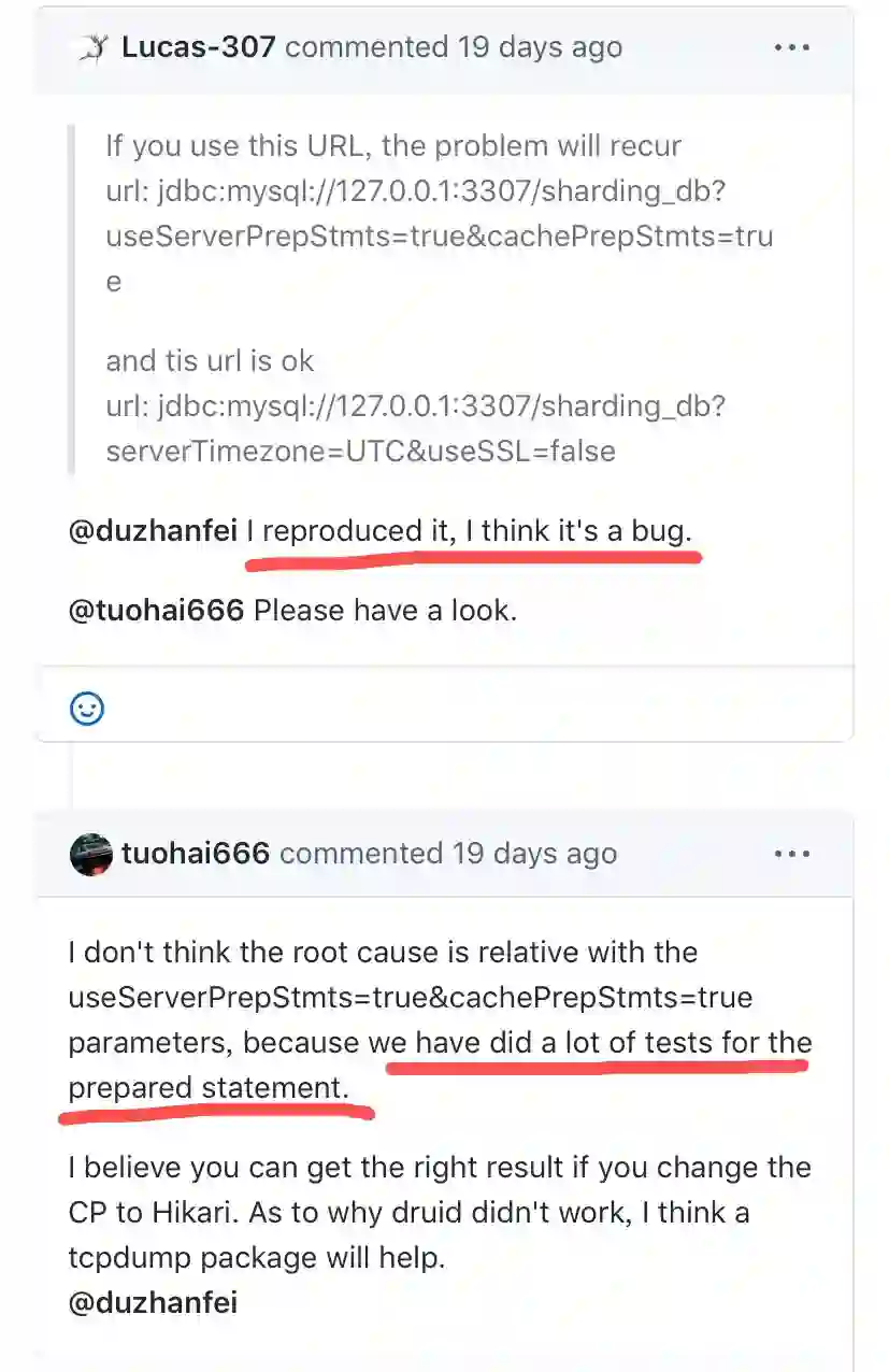 意思就是:我们针对预编译 SQL 功能做了大量的测试,这个是不可能存在问题的,建议你们更换下应用程序的数据库连接池,抓包继续分析下。(这个说法真让人非常无语,完全不是程序员严谨的思维!)