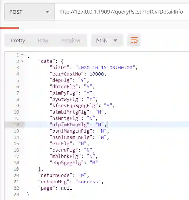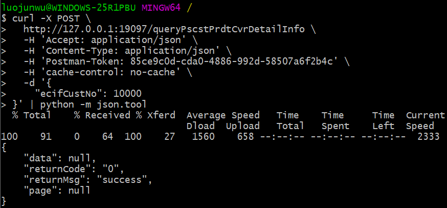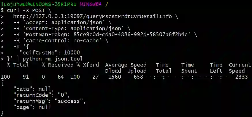 然后启动 demo 程序,使用 curl 发起 post 请求,查询 ecifCustNo 等于 10000 的那条记录,居然查询不出数据: