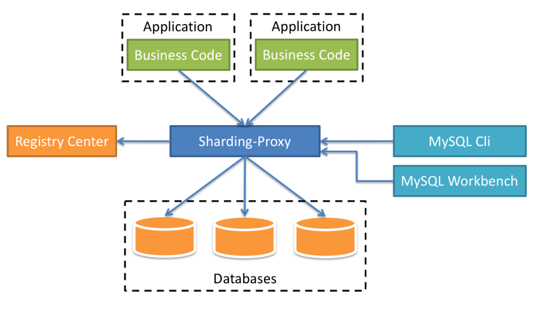 从架构图来看,ShardingProxy 就相当于 MySQL,它本身不存储数据,但是对外屏蔽了 Database 的存储细节,你可以用连接 MySQL 的方式去连接 ShardingProxy(除了端口不同),用你熟悉的 ORMapping 框架使用它。