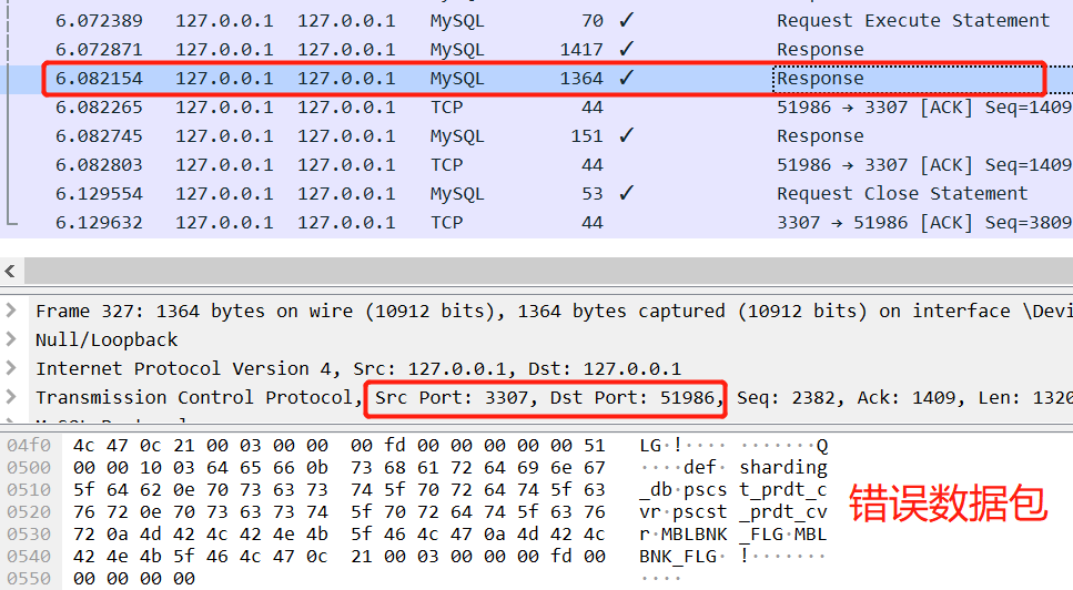 其中:mysql 表示 ShardingProxy 和 MySQL Server 之间的数据包,tcp.port==3307 表示 Demo 程序和 ShardingProxy 之间的数据包。