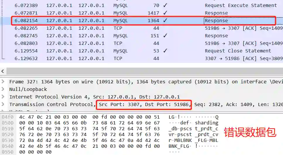 如果 ShardingProxy 内部存在 Bug,那一定是某个数据包出现了问题。顺着这个思路,很快就能发现:执行完 ExecuteStatement 后,MySQL Server 返回正确数据包给 Proxy 了,但是 Proxy 没有返回正确的数据包给应用程序。