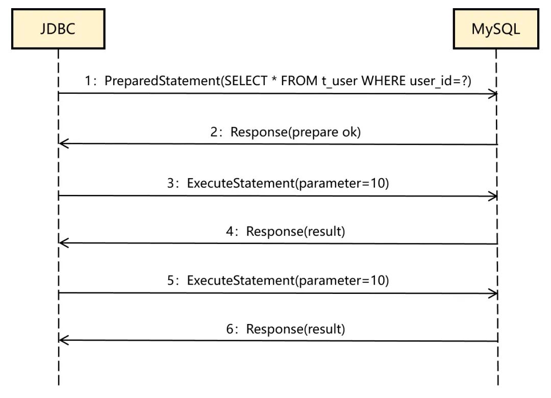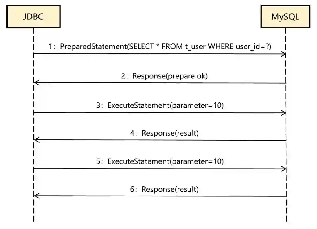 通过上述流程可以看到:第 1 条消息是PreparedStatement,查询语句中的参数值用问号代替了,它告诉 MySQL 对这个SQL 进行预编译;第 2 条消息 MySQL 告诉 JDBC 准备成功了;第 3 条消息 JDBC 将参数设置为 1 ;第 4 条消息 MySQL 返回查询结果;第 5 条和第 6 条消息表示第二次执行同样的 SQL,已经无需再次预编译了。