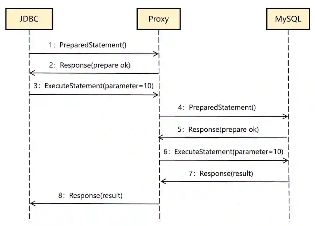 可以看到,Proxy在收到 PreparedStatement 命令后,并不会把这条消息转发给MySQL,只是缓存了这个 SQL,在收到 ExecuteStatement 命令后,才根据分片键和传过来的参数值确定真实的数据库,并与 MySQL 交互。
