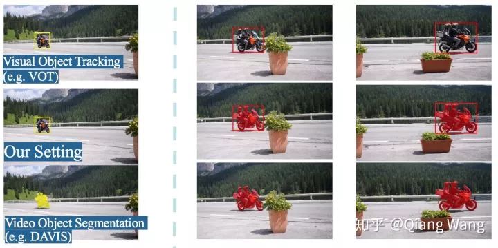 对比上述 VOS 算法,我们的算法更易于交互,只需要简单的画一个框,就可以实现自动的分割跟踪: