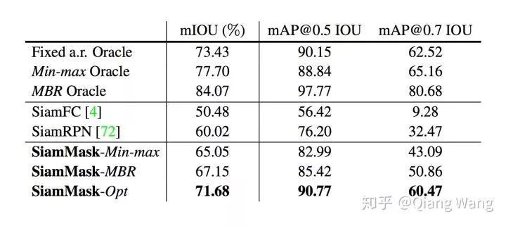 对照实验(ablation study)结果方面,我们首先通过实验分析验证了所提出的 Mask 的输出表达对于跟踪问题的贡献。通过进行 Oracle 实验分析,可以明确得出,旋转矩形框的平均 IoU 会远好于只预测坐标轴对齐的矩形框。尤其是在更高的 IoU 阈值下,旋转矩形框的优势更为明显。当对比 SiamFC,SiamRPN 的时候,SiamMask 对于整体的精度提升非常显著。对于输出 mask 转换为 box,有多重选择,我们使用了较为容易生成的最小外包矩形(MBR)。按照 VOT 的优化方式生成的框的质量会更高,但按照优化算法生成太慢。如果有编码好的同学可以把这个加速,我相信我们算法的精度至少可以再提升一个百分点,非常欢迎尝试之后在我们的 github 上提 Pull Requests。