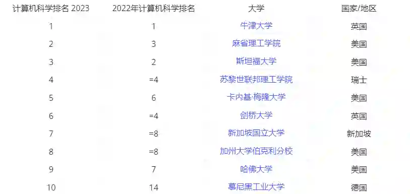 此次泰晤士世界大学计算机科学的学科排名中,约有 974 所院校上榜。全球前 10 名高校分别是牛津大学、麻省理工大学、斯坦福大学、苏黎世联邦理工学院、卡内基梅隆大学、剑桥大学、新加坡国立大学、加州大学伯克利分校、哈佛大学、慕尼黑工业大学。