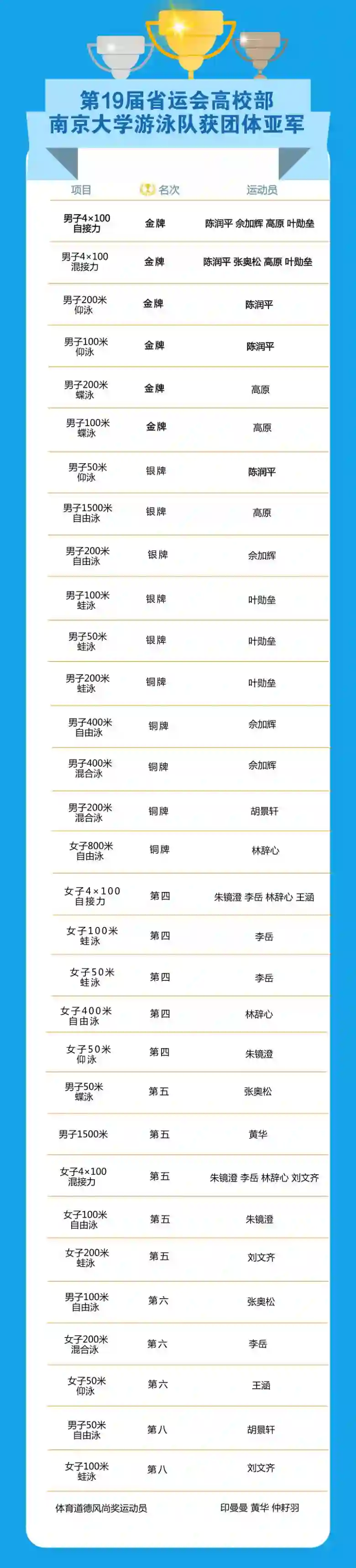 (南京大学游泳队第19届江苏省运动会高校部游泳比赛成绩单)