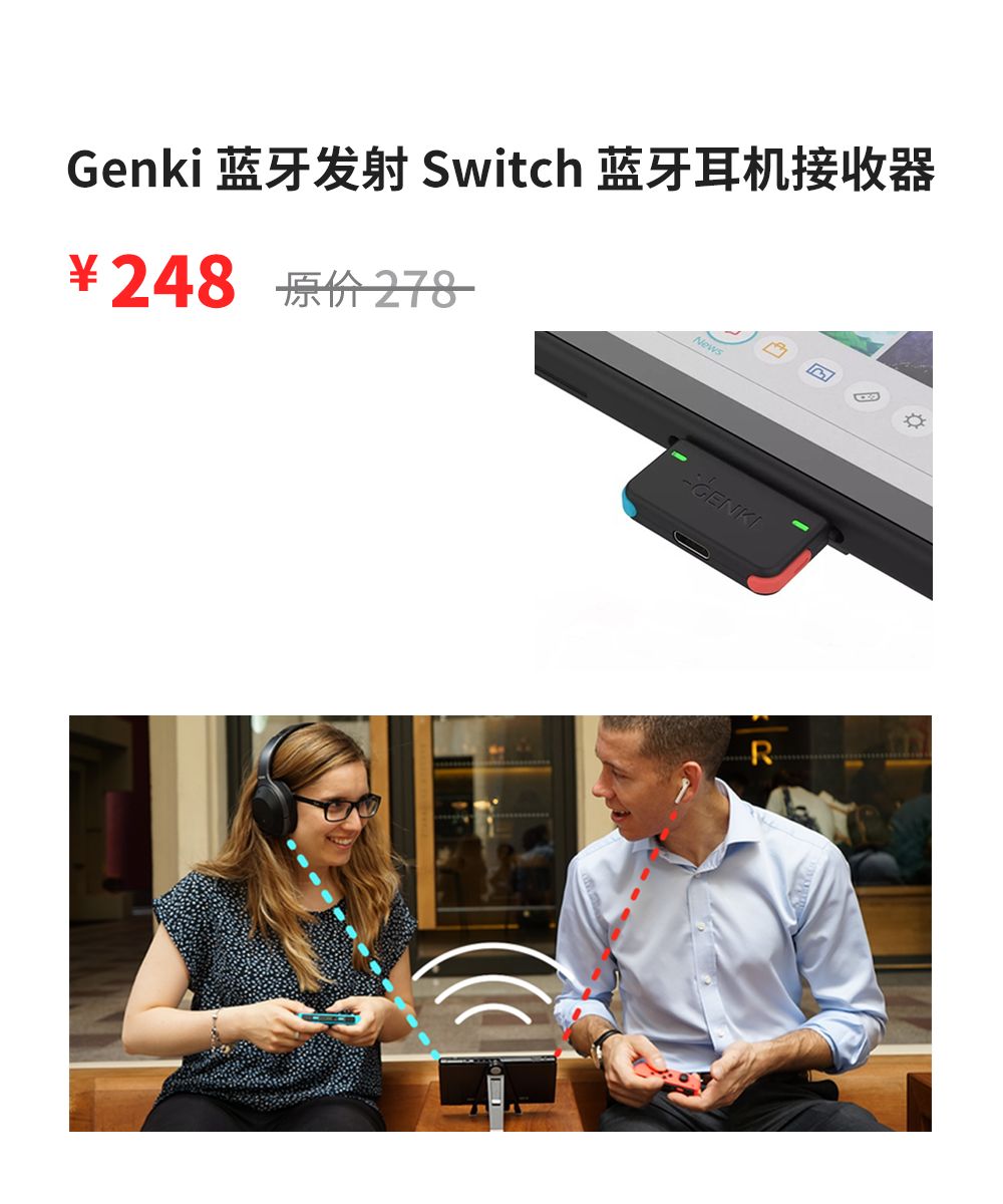 已经有 Switch 了?买个 Genki 蓝牙发射器获得更好的 Switch 游戏体验吧。Genki 支持同时连接两个蓝牙耳机和边充电边玩,对耳机型号没有要求,只要是蓝牙耳机都可以。连接配对很简单,只要长按配对按钮打开配对模式即可。没有明显的延迟,不用担心会影响游戏体验。
