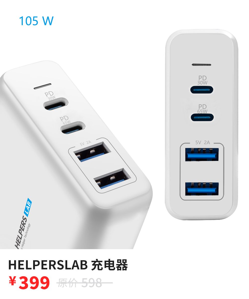 支持 65 W 的 C 口,专门给电脑使用,基本可以满足大部分日常供电需求,MacBook 完全没问题,另一个支持 30W 的 C 口给手机用,常规的 PD 和 PPS 协议都支持,大部分手机和 Pad 都能实现快充,就算平时习惯无线充电,也需要有个应急快充。总共 105W 的大功率,如果你也是多设备的数码控、极客玩家,推荐购买。
