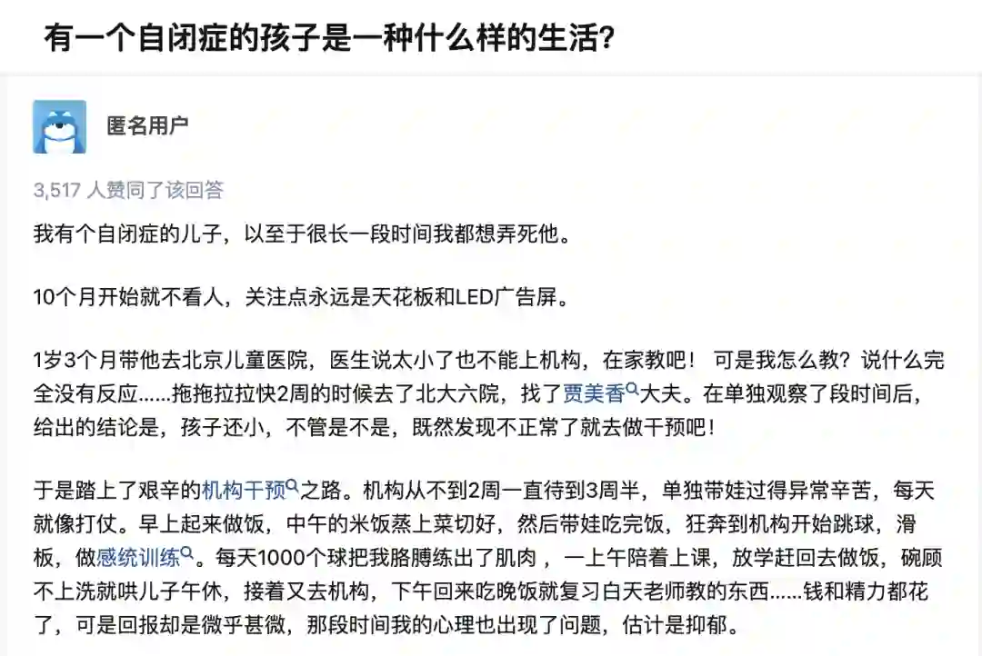 这是知乎上一位网友在“有一个自闭症的孩子是一种什么样的生活”问题下回答的第一句话。这位妈妈说,未来的路不敢想,“跟老公商量,等一个人百年之后,另一个就带着儿子一起走,等闺女(老二)长大了我也会告诉她,管哥哥是爸妈的事,你过好自己就行”。