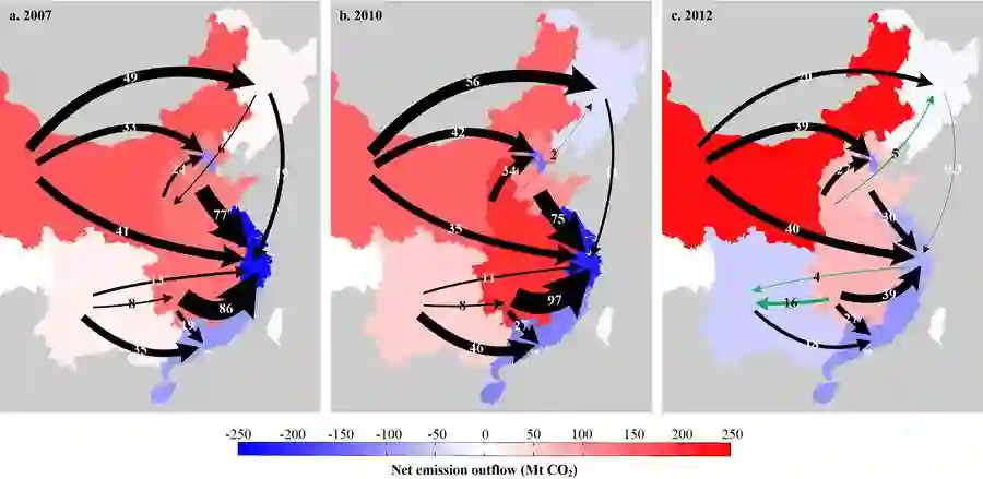 国内碳流动中,中国西部向东部地区的碳流动大幅下降;相反地,一些欠发达地区(比如西南地区)从碳排放净输出区域变成了碳排放净输入区域。整体来说,中国大量的碳排放从相对落后的中西部地区流向相对发达的东部沿海省份。换言之,东部沿海省份的生产与消费引起中西部大量的碳排放。依靠从中西部进口的高耗能、高排放、但低附加值的低端产品,东部省份生产并出口低耗能、低排放、但高附加值的高端产品。进入经济新常态后,虽然整体的碳流动方向依然是从西向东,但碳流动的量大幅下降。此外,一些欠发达地区(比如西南地区)从碳排放净输出区域变成了碳排放净输入区域。这主要是因为这些地区人均消费的快速增长引起的。随着一带一路倡议的推进,中国西部地区与欧亚大陆的贸易会更加频繁,中国从西向东的碳流动也有可能会进一步下降。