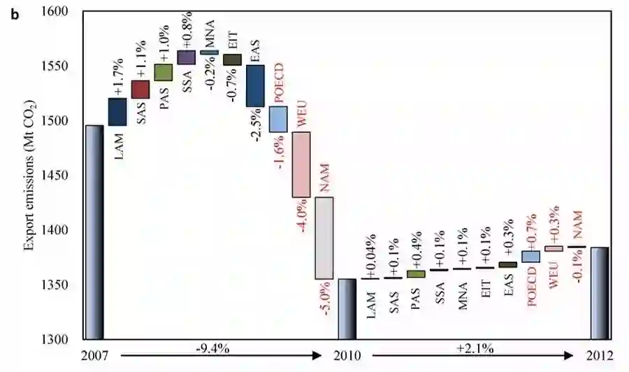 国际碳流动中,中国出口产品中隐含碳排放出现下降,并且从发达国家向发展中国家转移。金融危机以前,中国出口很大程度上依赖于发达国家的需求。2007年,中国出口碳排放中超过60%流向了北美、西欧等发达国家。金融危机以来,发达国家经济增长放缓,对中国产品的需求开始下滑。2007-2012年,中国流向北美和西欧的碳排放分别下降20%和16%。相反地,南南贸易(即发展中国家之间的贸易)快速发展。2007-2012年,中国流向拉丁美洲和南亚的碳排放分别增长33%和30%。截至2012年,中国出口碳排放中超过一半流向了拉丁美洲、非洲等发展中国家。中国正增加在新兴经济体中的投资,并促进与发展中国家的合作与贸易。截至2014年,中国在非洲的直接投资达320亿美元,投资建设超过3000家企业。随着南南贸易的快速发展,中国流向发展中国家的碳排放会进一步增长。