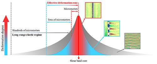 非晶合金,又称金属玻璃,是兼有一般金属和玻璃优异的力学、物理和化学性能的新型合金材料。非晶合金无序的原子结构使其成为具有高强度、高韧性、高弹性等一系列优异的力学性能的新型结构材料。不同于晶态合金中存在位错、晶界等承载变形的晶体缺陷,非晶合金的室温变形高度集中在纳米尺度的剪切带内,局域剪切带的软化和扩展最终导致非晶材料的失稳断裂。剪切带是非晶材料形变和流变的载体,对剪切带的认知和调控,是突破玻璃体系脆性瓶颈的关键。然而,由于没有直观可见的类似晶体位错的形变单元,非晶合金中剪切带的形成及演化机制的物理图像、剪切带之间是否又相互作用尚不清晰。