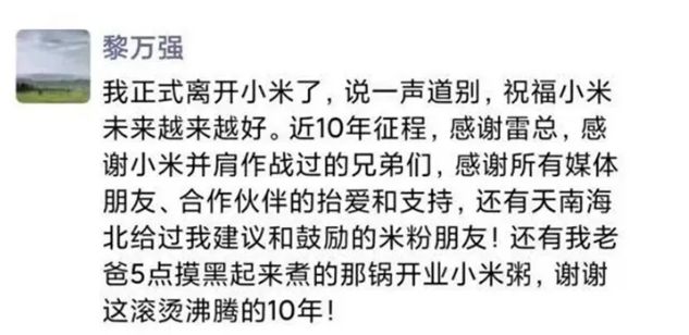 【黎万强:我正式离开小米,谢谢这滚烫沸腾的10年】11月29日,小米宣布联合创始人黎万强由于个人原因离职,改任高级顾问。随后,黎万强本人在朋友圈确认了这一消息,称谢谢这滚烫沸腾的10年。“我正式离开小米了,说一声道别,祝福小米未来越来越好,谢谢这滚烫沸腾的10年!”雷军则表示感谢阿黎创业以来的长期付出和巨大贡献。阿黎带领MIUI、小米网(小米销售与服务体系)、小米品牌市场体系等多项业务持续开荒,在商业模式验证执行、企业文化及品牌建设等多个领域,都作出了不可磨灭的贡献。(创业邦)