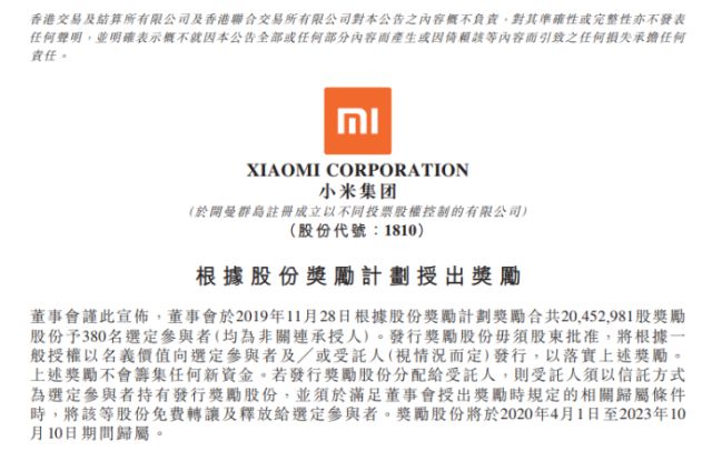 【小米公布股权激励:奖励380员工1.63亿元,人均43万元】11月29日,小米集团发布公告表示,董事会于2019年11月28日根据股份奖励计划奖励合共20452981股奖励股份予380名选定参与者(均为非关连承授人)。奖励股份将于2020年4月1日至2023年10月10日期间归属。以当天股价收盘8.98港元来就散,小米此次授出的股份奖励约1.82亿港币(约合1.63亿元人民币),平均每人43万。