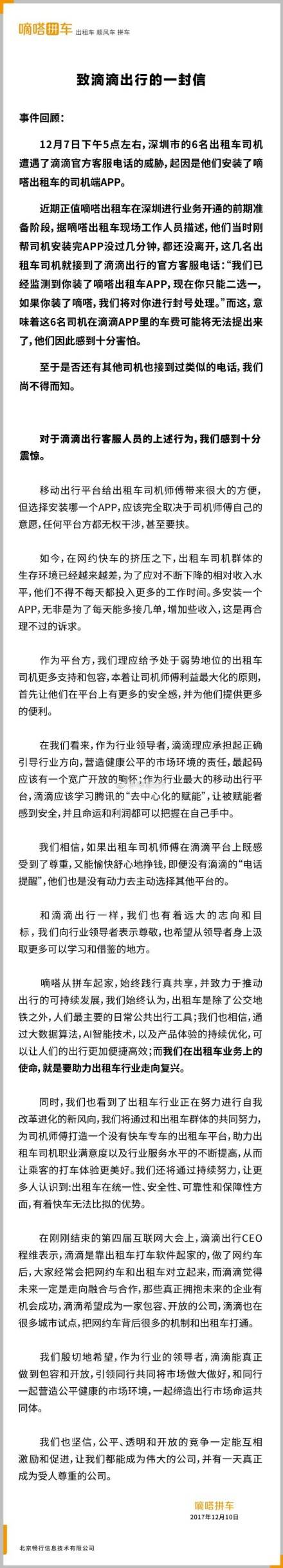 @IT之家【嘀嗒拼车致信滴滴出行:对“封号威胁司机二选一”行为震惊】12月10日晚间消息,嘀嗒拼车微博发布长文“致滴滴出行的一封信”。嘀嗒拼车声明表示,有出租车司机因安装嘀嗒拼车App遭遇滴滴官方客服电话威胁。