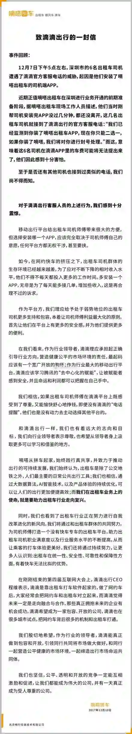嘀嗒给滴滴写长信,质疑滴滴不正当竞争