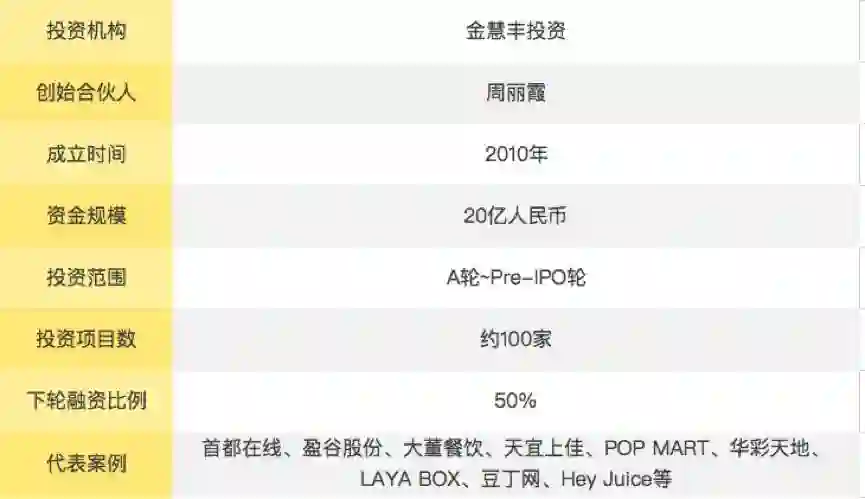 周丽霞在投资圈被冠为“新三板女王”,她于2009年成立金慧丰投资管理有限公司,曾投出首都在线、豆丁网、大董、POP MART、Hey Juice、天宜上佳等知名企业。