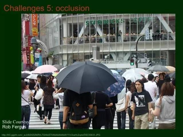 第五个难点是遮挡。遮挡是计算机视觉特别关心的一个难点。比如说,这个图片里熙熙攘攘的人中,我们知道这大概是一个女孩:她有棕色的头发,穿着一个短袖衫。我们人的本领很强,这种情况下还能识别出男女。但是计算机现在还做不到这一点。