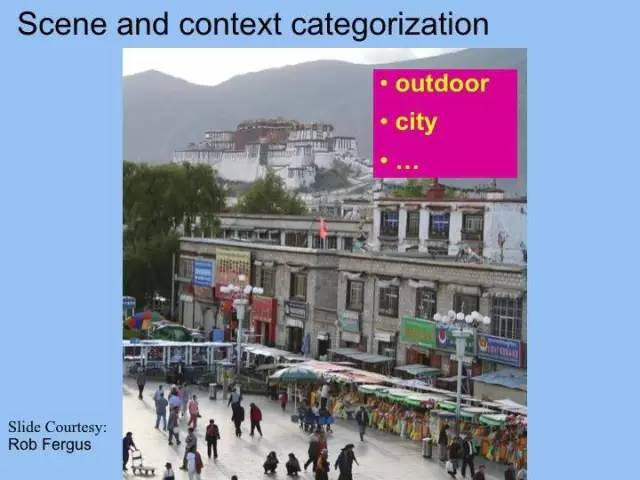 图像识别是什么?以这张图像为例,第一个问题是:在这个图像里面有没有街灯。在学术研究中,我们把这个问题叫作图像检测。第二个问题就是把街灯的位置给找出来,这叫做定位。第三个问题是物体的分类和识别,指出这是山,这是树,这个是招牌,建筑。我们可能还会对整张图片做一个场景的分类,是在什么环境下拍照的。它可能是一个室外的图像,关于城市的生活等等。基本上这些就是我们在图像识别里面涉及到的一些可能的研究问题。