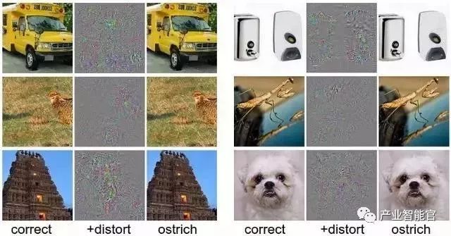 如图所示,每张图像强加一个噪音图像,视觉上不会改变原始图像,但被错误分类为鸵鸟!