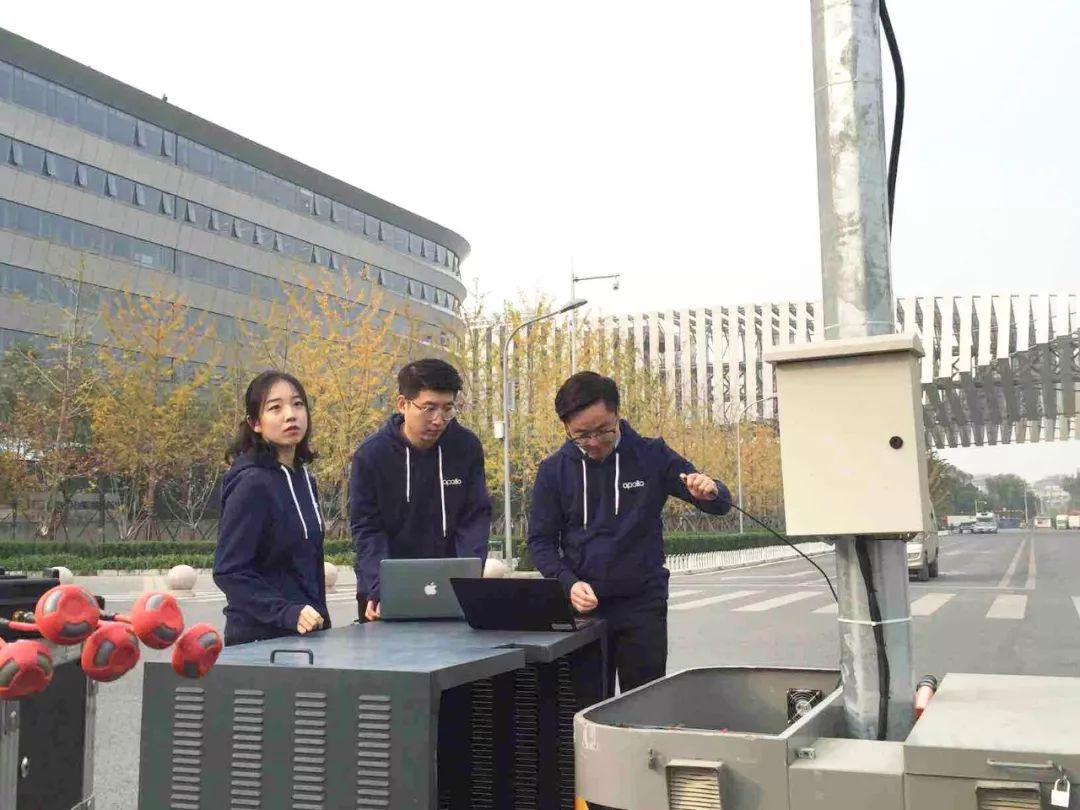 时晨阳(左一)和同事们在百度科技园门前的十字路口调试设备