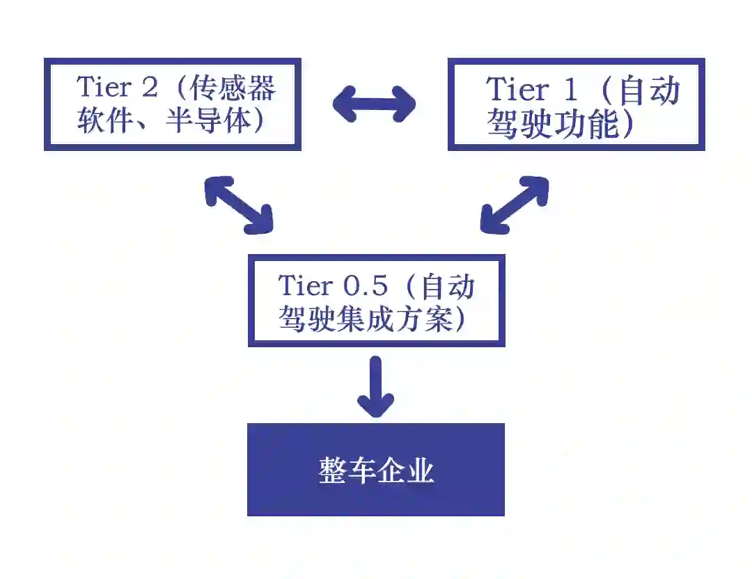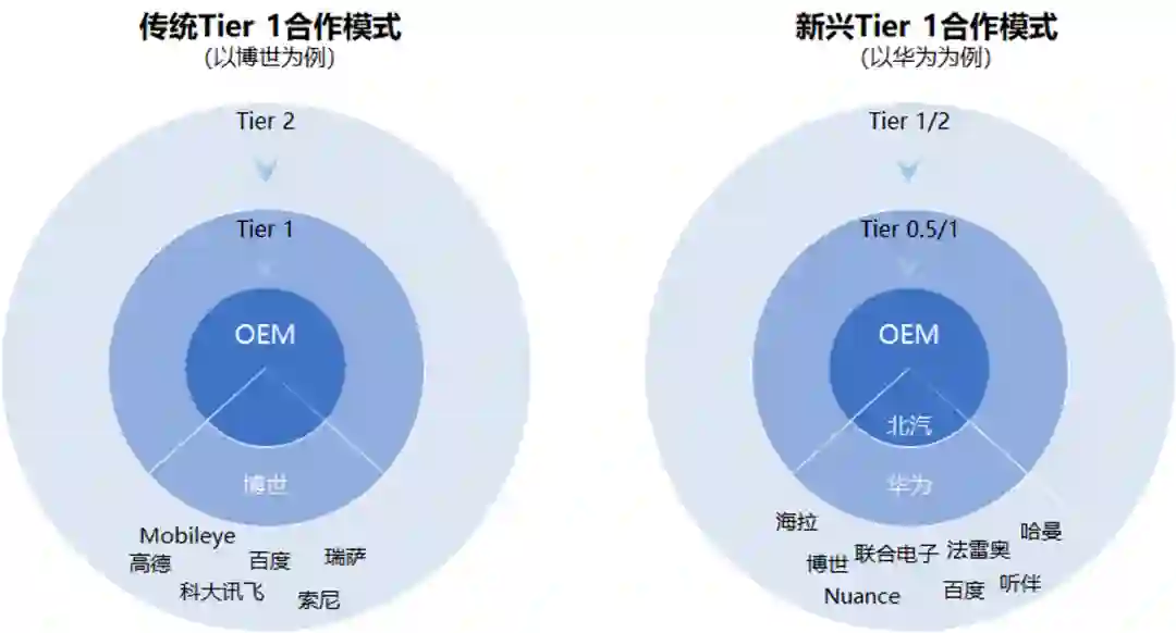 这是因为,转型背后有一个大难题:智能化导致车企研发任务指数级加剧。为了缓解研发压力,一些车企也在与 Tier 1 探索全新的合作模式,车企只做上层研发,将底层交给 Tier 1。甚至还在两者中间出现了 Tier 0.5,供应商替车企进行零部件采购和集成研发,直接提供电驱、底盘等完整的解决方案,车企只负责最终的结果呈现。