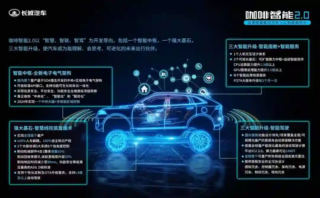 这也是长城汽车能够布局咖啡智能 2.0 升级的关键,掌握自研全新电子电气架构、自研座舱系统和智能生态、自研全球量产能效比最高的自动驾驶计算平台 IDC 3.0 等智能化核心技术,具备从底层硬件到上层软件的全面研发能力。
