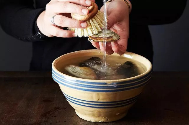 在烹饪贝壳类食物之前,要先冲洗,以去除部分沉淀物。然后把它们放入一盆冷水中,并加入适量的盐以刺激吐沙,再放入冰箱20到30分钟,等待的过程中记得轻微搅拌几次。从冰箱里拿出后,不要倒,而是用手将贝壳捞出,这时候可以在锅底看到细砂。最后,再冲洗外壳,并且用干净的小刷子洗刷外壳。这样就可以得到干净的贝壳类食物了。
