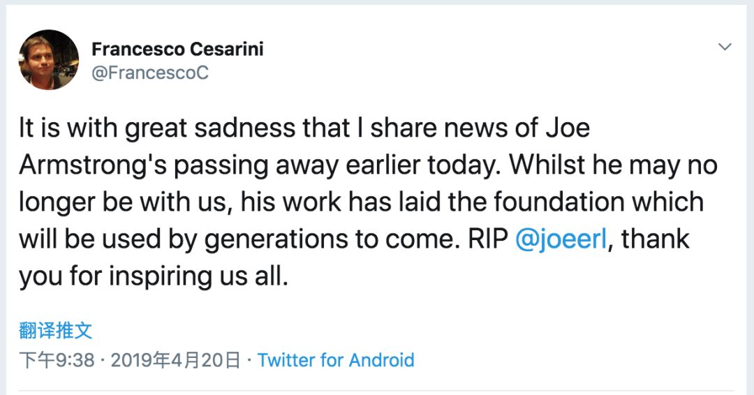 Erlang Solutions 创始人、技术图书作者 Francesco Cesarini 昨日发推,Erlang 语言发明人 Joe Armstrong 去世:
