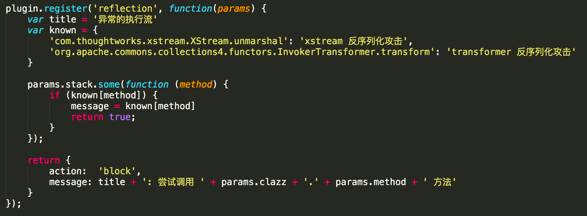 无论是xstream,还是transformer反序列化漏洞,最终都要通过反射的方法,调用敏感类,执行任意代码。OpenRASP 允许你对指定的方法进行监控,当这些方法通过被反射调用,将会触发安全检测流程