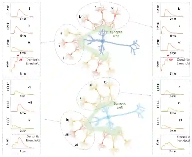 编辑 | 萝卜皮众所周知,大脑中的可塑性回路通过突触整合和突触强度的局部调节机制受到突触权重分布的影响。然而,迄今为止设计的大多数人工神经网络训练算法都忽略了刺激依赖性可塑性与局部学习信号的复杂相互作用。在这里,IBM 研究院的研究人员,提出了一种新的受生物学启发的人工和尖峰神经网络优化器,该优化器结合了在皮质树突中观察到的突触可塑性的关键原则:GRAPES(Group Responsibility for Adjusting the Propagation of Error Signals)。GRAPES 在网络的每个节点上实现了与权重分布相关的误差信号调制。研究表明,这种受生物学启发的机制可以显着提高具有前馈、卷积和循环架构的人工和尖峰网络的性能,它可以减轻灾难性遗忘,并且最适合专用硬件实现。总而言之,将神经生理学见解与机器智能相协调是提高神经网络性能的关键。该研究以「Introducing principles of synaptic integration in the optimization of deep neural networks」为题,于 2022 年 4 月 7 日发布在《Nature Communications》。人工神经网络 (ANN) 在 1940 年代首次提出,作为哺乳动物大脑神经回路的简化计算模型。随着计算能力的进步,人工神经网络偏离了它们最初受到启发的神经生物学系统,并重新定位于目前广泛应用中使用的计算技术的发展。在提出的用于训练多层神经网络的各种技术中,反向传播 (BP) 算法已被证明是一种有效的训练方案。尽管机器智能取得了令人瞩目的进步,但人工神经网络的潜力与大脑计算能力之间的差距仍有待缩小。人工神经网络的基本问题,如训练时间长、灾难性遗忘和无法利用日益增加的网络复杂性,不仅需要处理人类大脑的能力,还需要提高日常使用设备的性能。例如,减少机器人应用程序中在线学习的训练时间对于确保机器人代理快速适应新环境并降低与训练相关的能源成本至关重要。已经提出了几种技术,例如批量归一化、层归一化和权重归一化,以加速 ANN 的训练。这些方法虽然成功地提高了收敛速度,但距离生物大脑的学习能力还差得很远。与哺乳动物的神经回路相比,人工神经网络在大脑方面的局限性很大程度上归因于其结构和动力学的大幅简化。对大脑功能至关重要的几种机制,包括突触整合和体重强度的局部调节,通常不在基于 BP 的人工神经网络训练中建模。克服这一限制可能是使人工网络的性能更接近动物智能的关键。突触整合是神经元在产生动作电位 (AP) 之前结合数千个突触前神经元接收到的尖峰序列的过程。轴突 AP 在细胞的轴突中被引出,作为对从细胞树突接收到的输入的响应,并充当神经元的整体输出信号。实验证据表明,至少在 CA1 细胞中,由于树突的活跃特性,来自不同突触前神经元的输入信号到达同一突触后细胞可能与非线性动力学相互作用。具体而言,当在树突分支中发生强去极化时,在该区域中引发树突AP。树突状 AP 会提高产生它的兴奋性突触后电位(EPSP)总和的幅度,从而在树突状输入到达胞体之前放大树突状输入以引发轴突 AP。树突尖峰的产生需要空间上连接到同一分支的足够多的突触前细胞在时间上以足够的突触强度活跃。因此,突触输入影响突触后神经元输出的能力取决于它们在树突树中的位置。神经元强大的计算能力被认为源于源自树突尖峰的复杂非线性动力学。下图表明了这种机制,并显示了每个突触前神经元的影响如何还取决于通过其他突触前连接传递到同一突触后神经元的信号。因此,局部权重分布可以负责提升特定节点的输入信号。与大脑中的神经元类似,ANN 中的节点接收来自许多细胞的输入并产生单个输出。研究人员可以将人工节点的激活与轴突 AP 联系起来,但树突 AP 的机制并没有严格地转化为点神经元的动力学。然而,树突尖峰受到树突分支内突触强度分布的强烈影响。类似地,人工节点的非线性动力学受到进入一层节点的突触权重分布的影响。令人惊讶的是,在人工神经网络的常见训练方法中,缺乏考虑每个节点权重分布的机制。