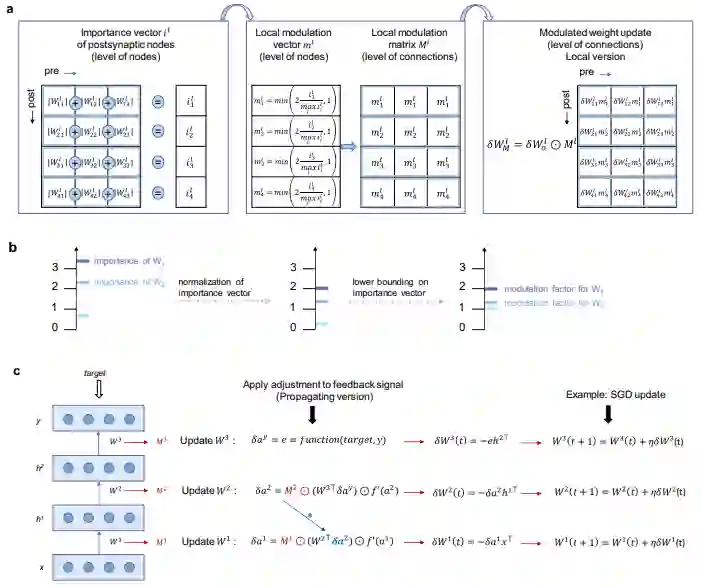 图示:生物和人工网络中的突触强度分布。(来源:论文)此外,大脑中的突触可塑性主要由局部信号驱动,例如邻近神经元的活动。突触之间的局部相互作用在调节学习过程中的体重变化中起着至关重要的作用。在这种情况下,异突触竞争机制允许通过限制连接到相同突触前或突触后神经元的突触的总强度来调节突触生长。这种现象发生在每个神经元的突触之间的非线性竞争。受非线性突触整合和局部突触强度调节的生物学机制的启发,IBM 研究院和苏黎世大学的研究人员提出了 GRAPES(调整错误信号传播的组责任),这是一种用于 ANN 和 SNN 训练的新型优化器。GRAPES 依赖于节点重要性的新概念,该概念将网络中每个节点的责任量化为层内局部权重分布的函数。图示:调制因子的计算。(来源:论文)应用于基于梯度的优化算法,GRAPES 提供了一种简单有效的策略来动态调整每个节点的误差信号并增强最相关参数的更新。与动量等优化器相比,该方法不需要存储先前步骤的参数,避免了额外的内存损失。这个特性使得 GRAPES 在生物学上比基于动量的优化器更合理,因为神经回路不能保留来自先前状态的大部分信息。研究人员在五个静态数据集(MNIST、CIFAR-10、CIFAR-100、Fashion MNIST 和 Extended MNIST)上使用 ANN 以及在时间速率编码的 MNIST 上使用 SNN 验证了该方法。他们成功地将 GRAPES 应用于监督学习的不同训练方法,即 BP、FA 和 DFA,以及不同的优化器,即 SGD、RMSprop 和 NAG。研究人员证明了所提出的基于权重的调制可以在 ANN 和 SNN 中带来更高的分类精度和更快的收敛速度。之后,他们展示了 GRAPES 解决了 ANN 的主要限制,包括缓解性能饱和以增加网络复杂性和灾难性遗忘。