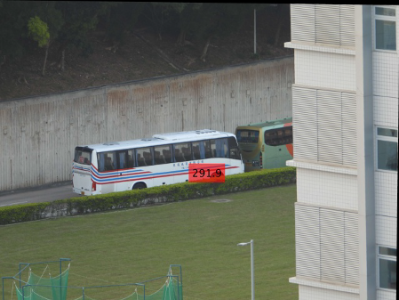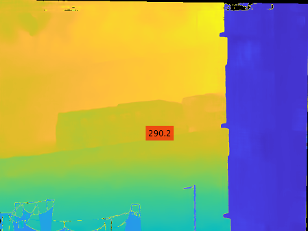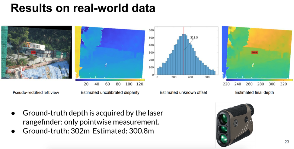由于这个问题的现实数据采集难度很高,本文做了资源允许情况下的最大力度验证。本文把一个配备了长焦镜头和三脚架的相机依次放到相机系统示意图中的三个位置,并且用激光测距仪测量了left相机中心点的深度作为真实值。实验结果显示,本文的方法得到的深度(300.8米)跟激光测距仪测量的值(320米)吻合得很好(如下图2所示),并且我们的方法输出的是深度图,而非激光测距仪给出的单点深度。